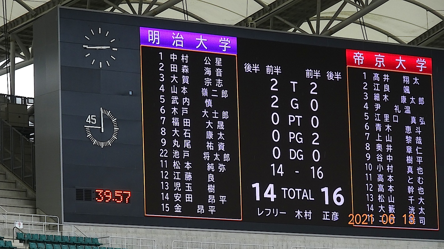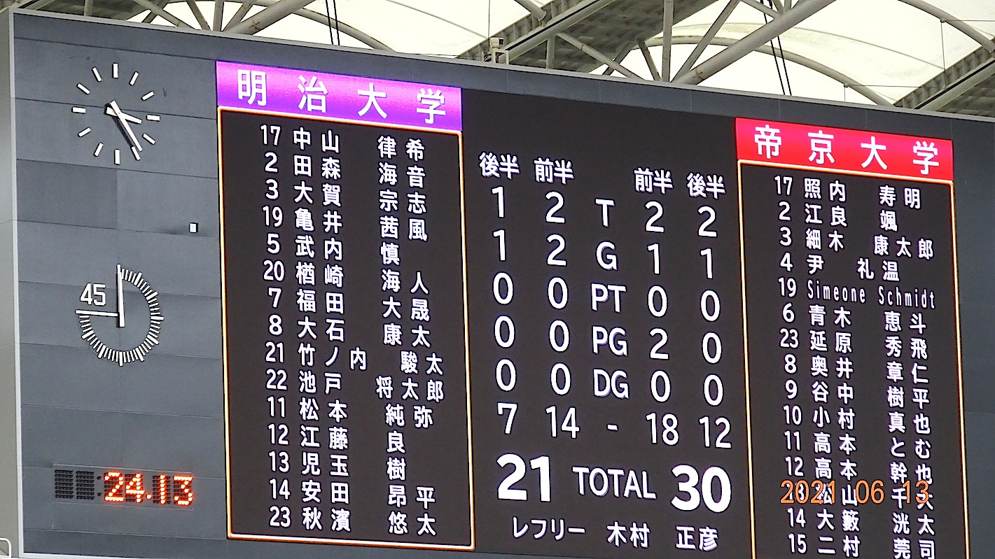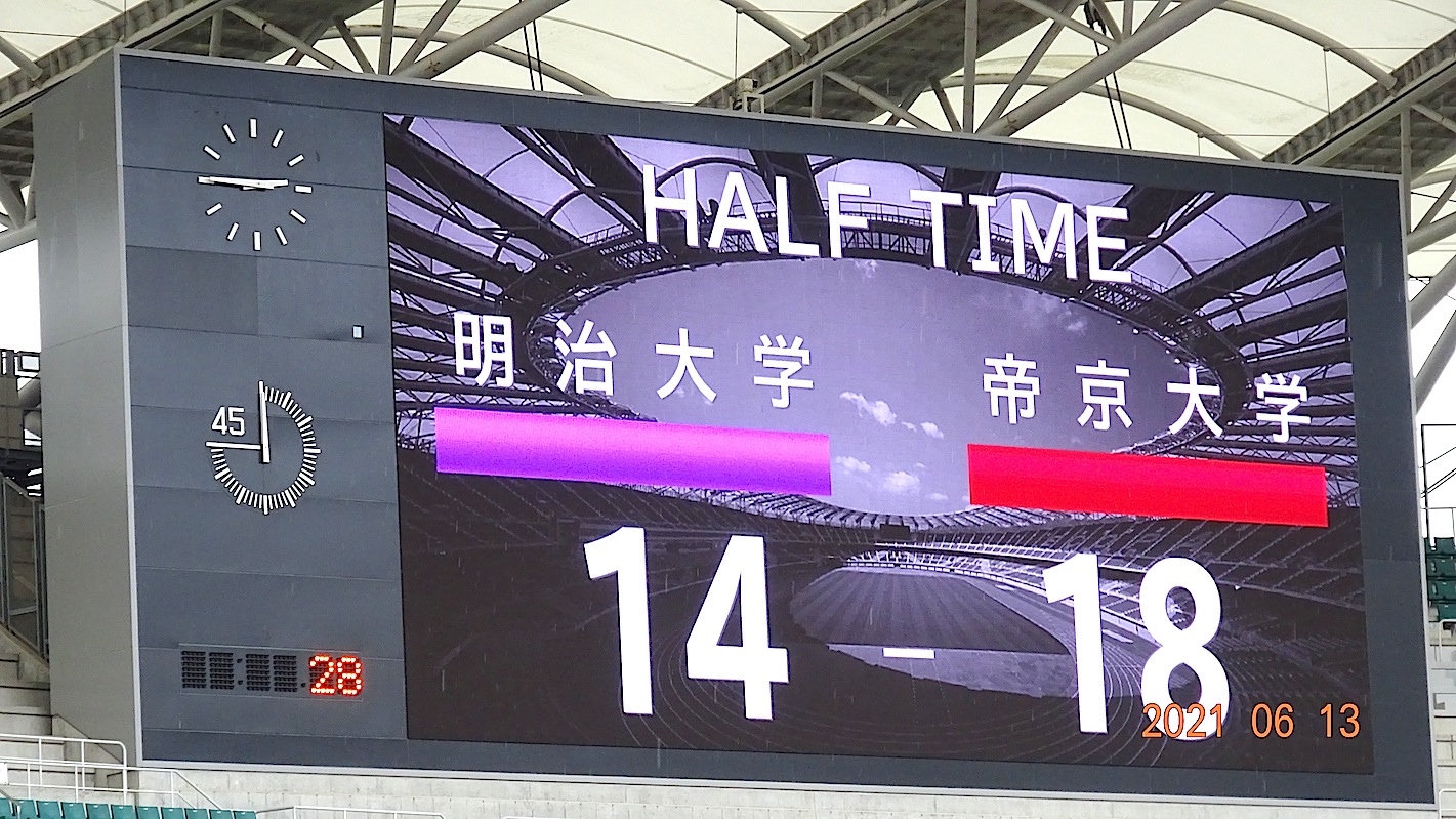 前半45分は、帝京リード(18対14)で折り返し、後半一時的に明治が