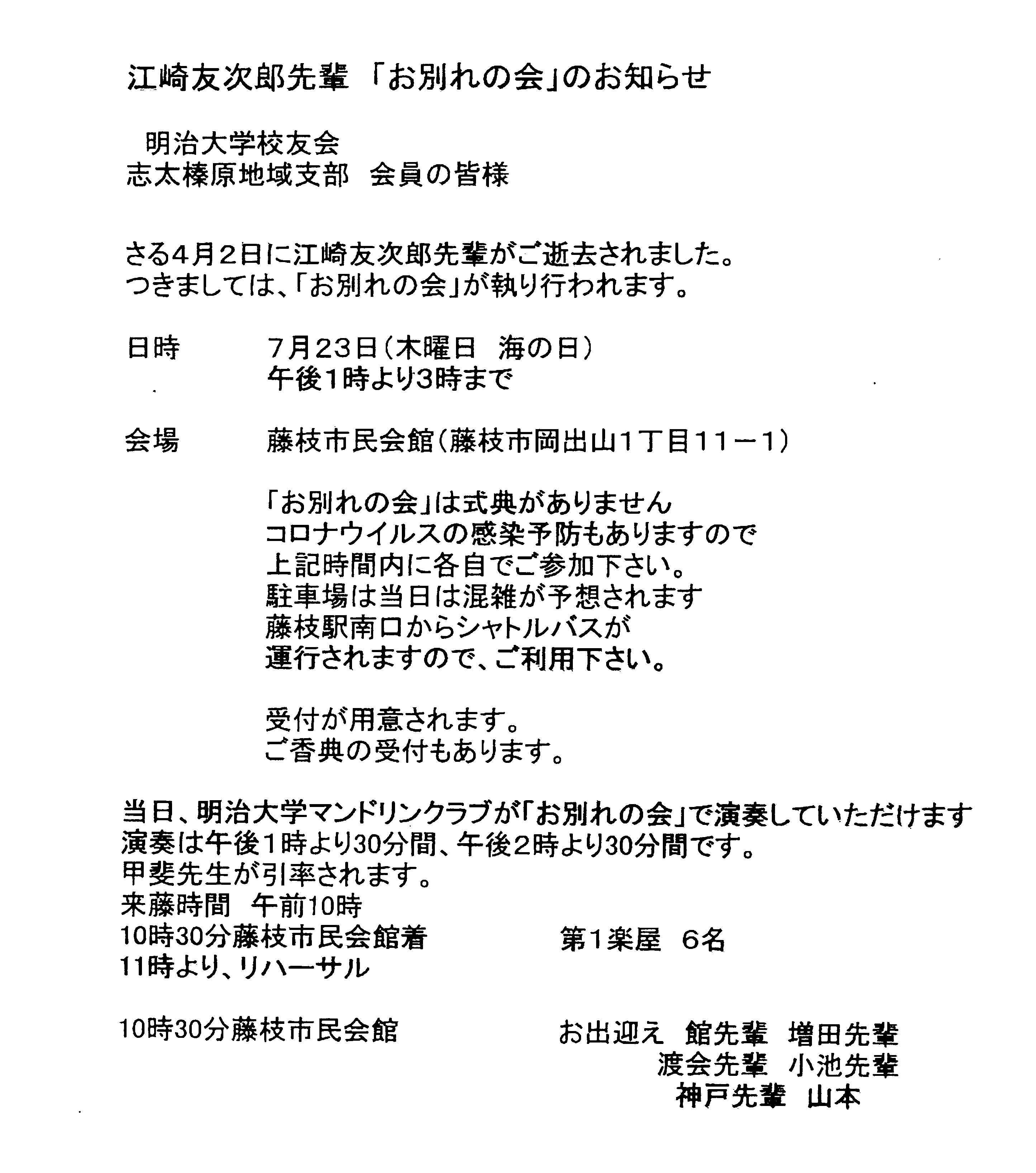 名誉支部長 江﨑友郎様の「お別れの会」は下記の日程で執り行われます。 記